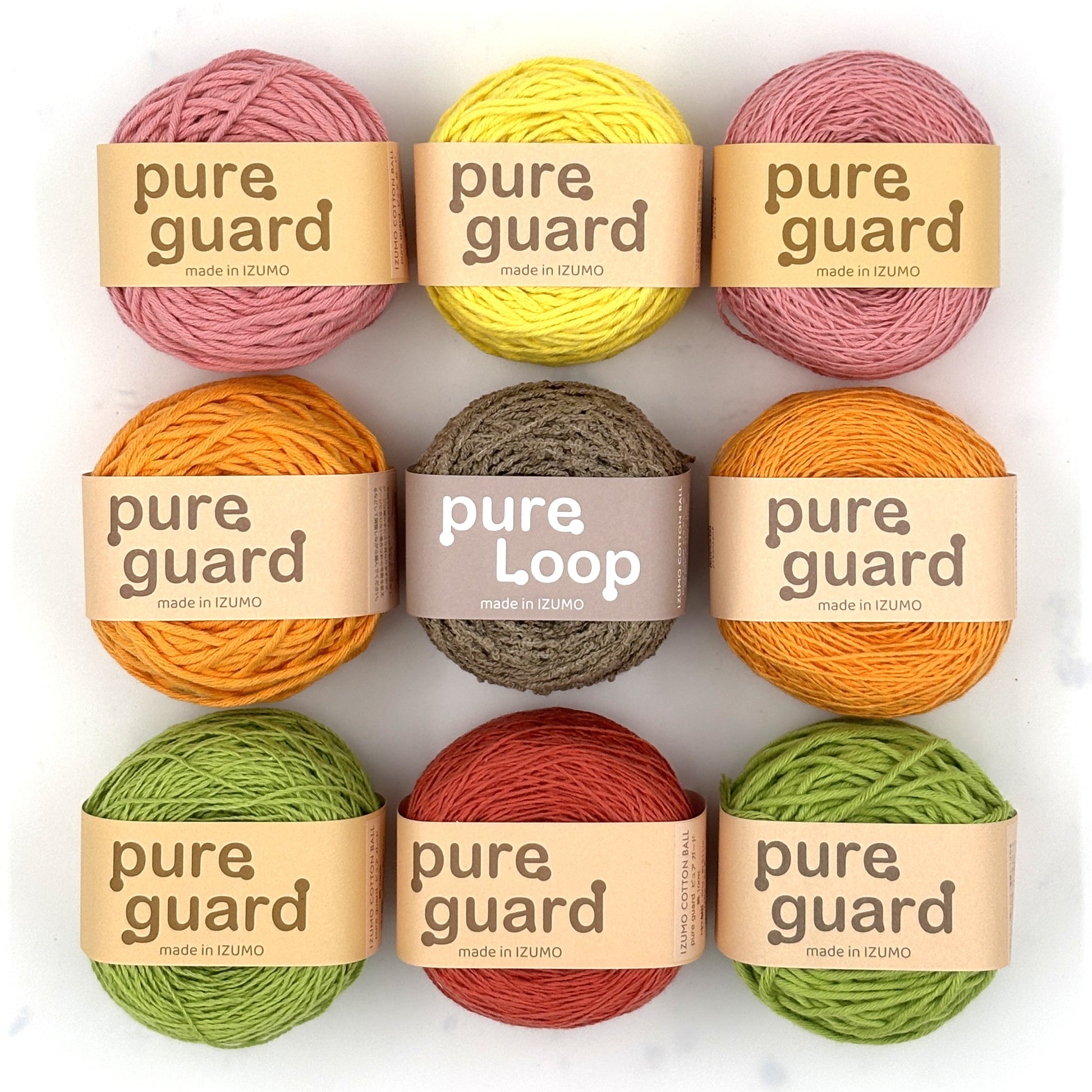 綿糸で作られたループヤーンです。綿部分には出雲紡績工場の最新技術による抗菌加工が施されており、清潔にお使いいただけます。2本のループヤーンを組み合わせているため、「2本どり」のような編み心地が特徴です。